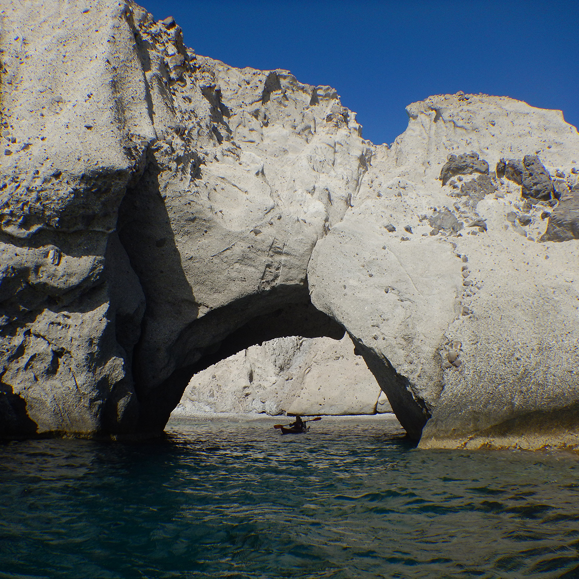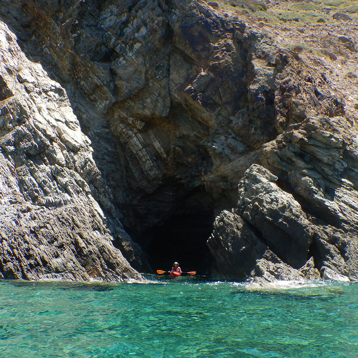 Paddling the south coast of Antiparos exploring caves and arches. Finishing the trip at the port of Antiparos.